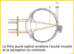 La lumière bleue se brise plus facilement que la lumière rouge. En se concentrant sur les différents niveaux de perception de l'œi,l on observe que la lumière bleue de grande longueur d'onde produit des aberrations chromatiques et des visions floues. C'est pourquoi les pilotes et les athlètes portent souvent des lunettes jaunes car elles filtrent la proportion de lumière bleue, ce qui accroît l'acuité visuelle et la netteté du contraste. Souvent, les patients souffrant de "DMLA obtiennent des prescriptions de lunettes avec des lentilles jaunes, afin de protéger leur macula de la lumière bleue destructrice.