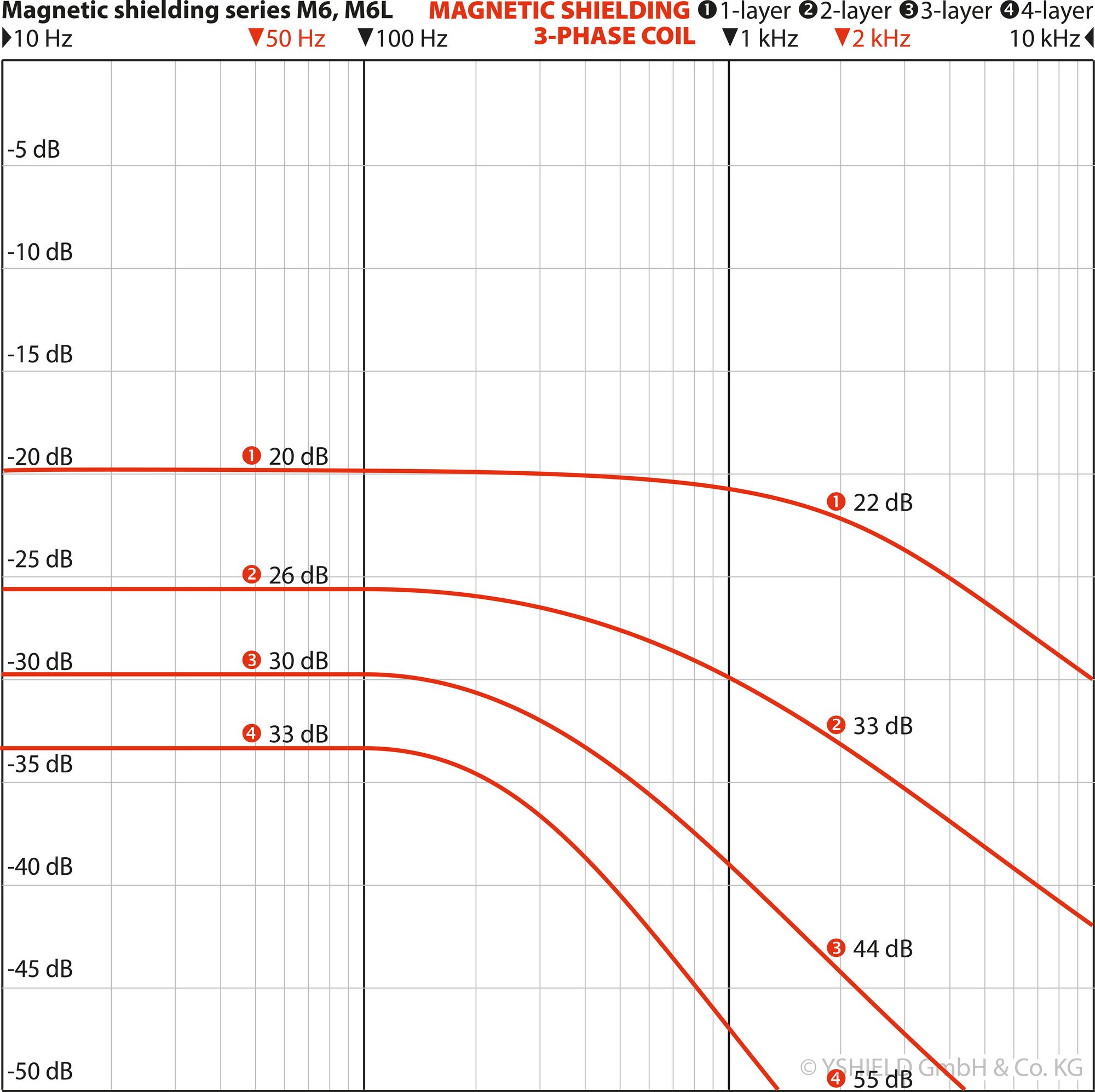 - Atténuation des champs magnétiques (statiques) : les consommateurs de courant continu, le champ magnétique terrestre et les aimants permanents sont blindés dans une plage comprise entre 15 % (une couche) et 58 % (quatre couches)