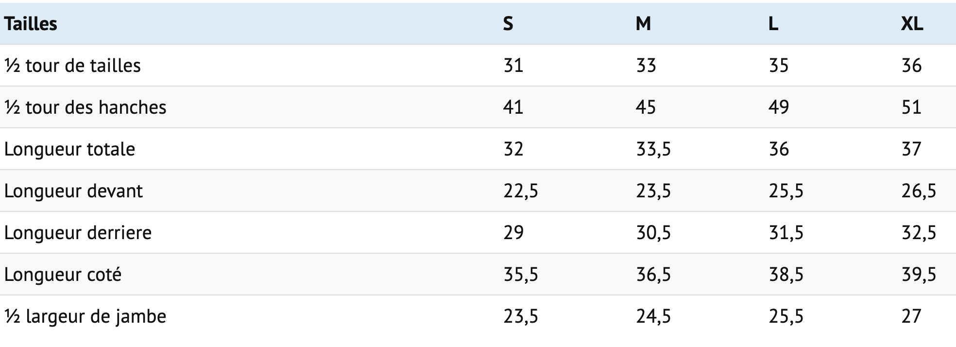 Tailles: