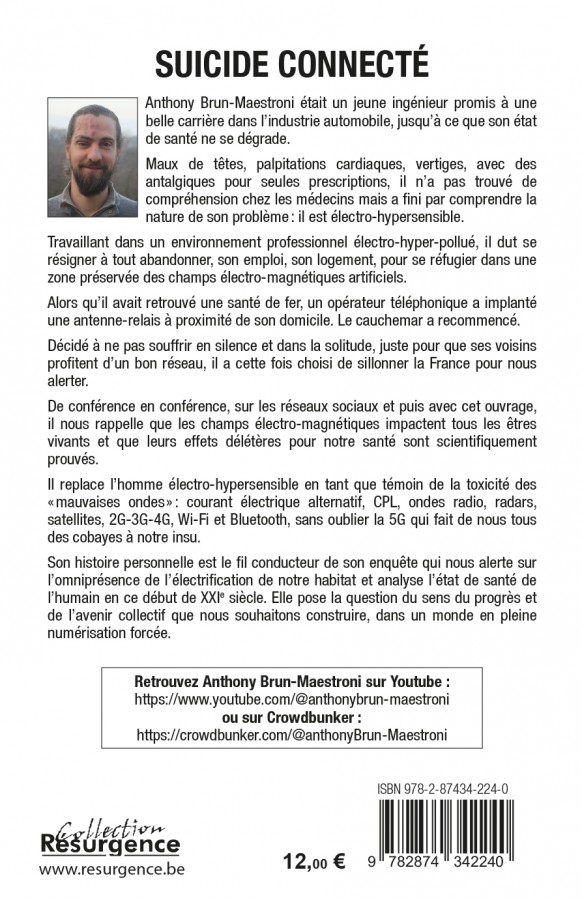 L’auteur replace l’homme électro-hypersensible en tant que témoin de la toxicité des « mauvaises ondes » : courant électrique alternatif, CPL, ondes radio, radars, satellites, 2G-3G-4G, Wi-Fi et Bluetooth, sans oublier la 5G qui fait de nous tous des cobayes à notre insu.